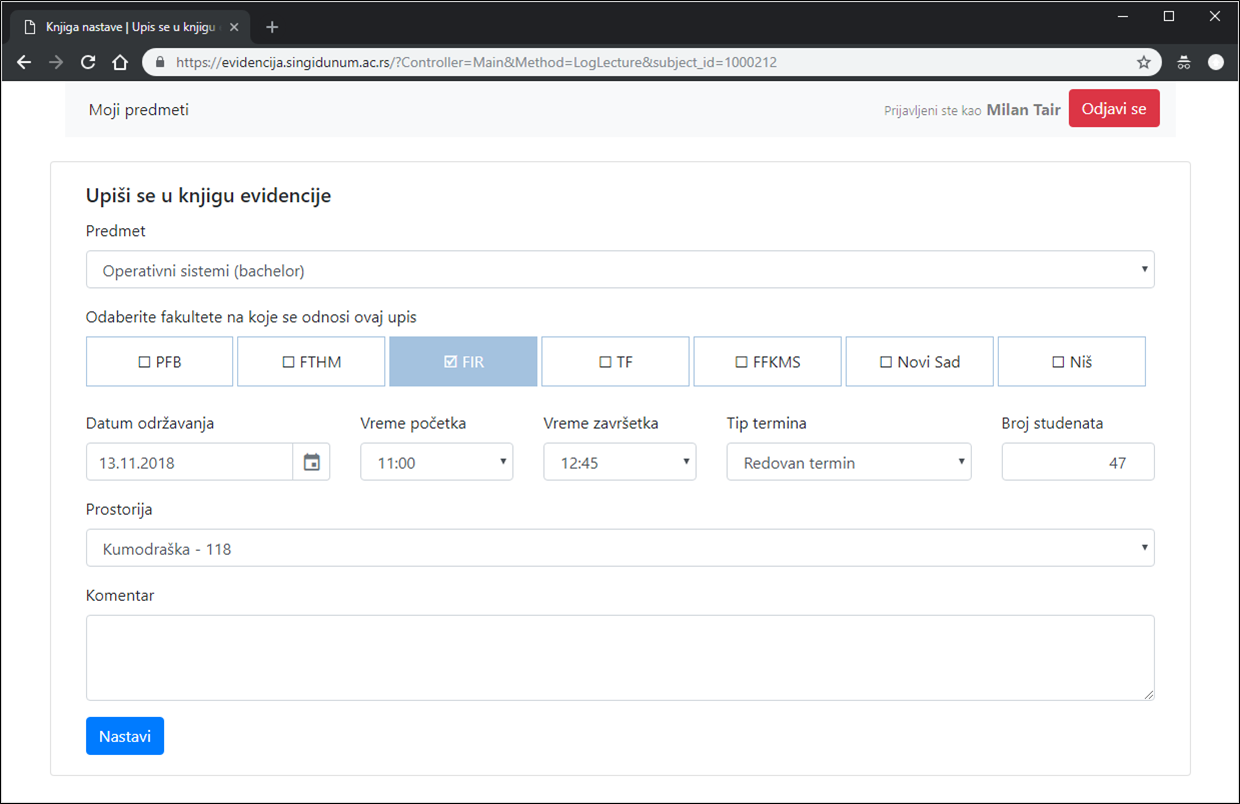 Ukoliko predmet u istom terminu slušaju studenti sa više smerova različitih fakultetâ, npr. predmet Baze podataka u jednoj grupi slušaju studenti 2. godine IR (FIR) i studenti 3. godine ER (TF), potrebno je obeležiti i FIR i TF fakultete. - Odabir datuma termina nastave/konsultacija (aplikacija dozvoljava odabir datuma do 5 dana unazad).