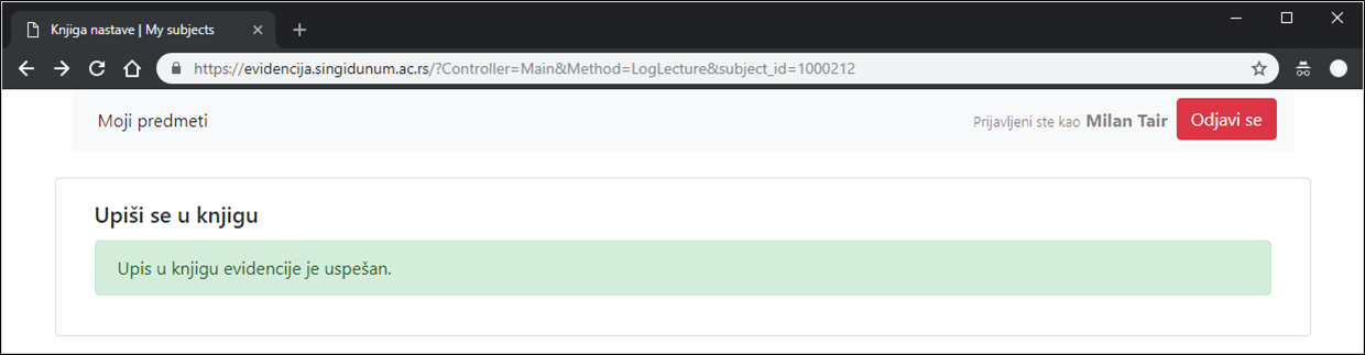 pokreće postupak upisa održanog termina u elektronsku eviceniju, nakon čega treba da dobije poruku o uspešnom upisu u knjigu evidencije.