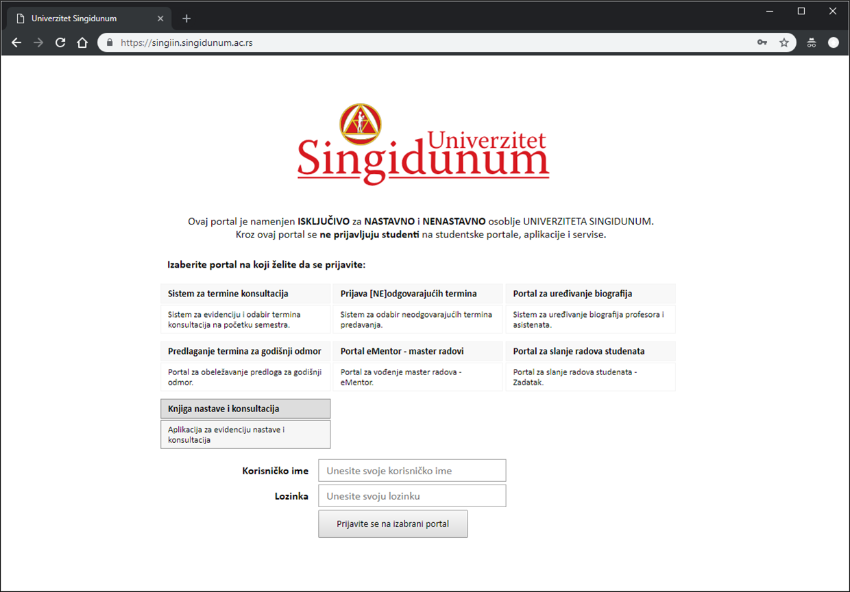 Ukoliko niste u mogućnosti da se prijavite na aplikaciju "Knjiga nastave i konsultacija", obratite se na webmaster@singidunum.ac.rs.