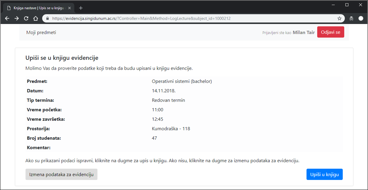 Nakon klika na dugme za nastavak, otvara se prikaz podataka unetih u formular, gde nastavnik treba da pregleda podatke koji će biti upisani u knjigu evidencije nastave i konsultacija.