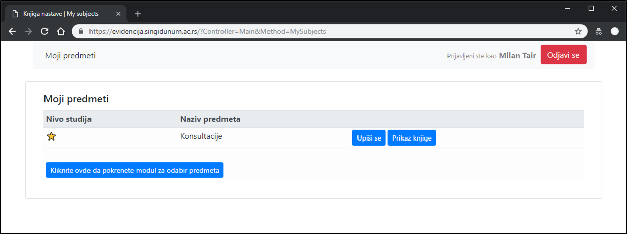 koje se nalazi na dnu liste svih predmeta, nakon čega će nastavnik biti vraćen na početnu stranicu na kojoj je prikazan spisak odabranih predmeta.