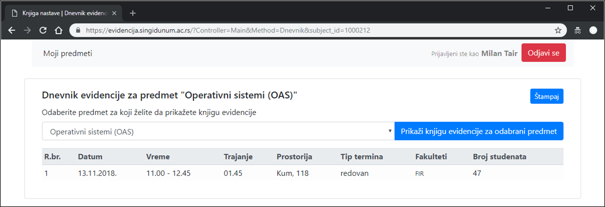 Svaki nastavnik treba sâm za sebe da izvrši odabir predmeta na kojima je angažovan i za koje će da vrši evidenciju nastave.