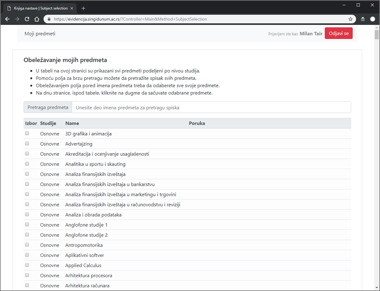 Nastavnici obeležavanjem kvadratnog polja (check-box) pored imena predmeta treba da izvrše odabir predmeta koji treba da im budu dodeljeni za evidenciju nastave. Za lakše pronalaženje predmeta na listi, predmeti su poređani po nivou studija i po nazivu, a dostupan je i mehanizam brze pretrage koji reaguje na unos najmanje tri karaktera imena predmeta.