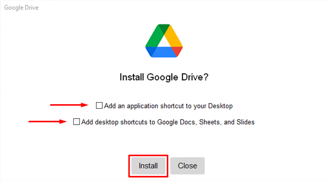 Levim duplim klikom pokrećete instalacioni fajl koji će Vas pitati da li ste sigurni da želite da instalirate softver. Složite se sa tim pritiskom na dugme "Yes". Nakon ovog koraka pojaviće se prozor koji će pitati da li želite da Google Drive aplikaciju dodate kao ikonicu na Desktop i da li želite da imate prečice i ka Google dokumentima, radnim listovima i slajdovima (Word, Excel i PowerPoint). Kako za tim nema potrebe, obe kućice (eng. checkbox) je potrebno da ostanu prazne i pokrećete instalaciju pritiskom na dugme Install (pogledati sliku ispod).