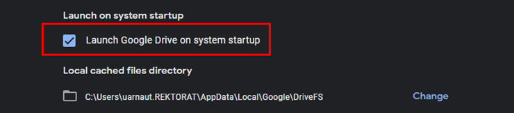 Potrebno je da potražite opciju Lunch on system startup, gde ćemo označiti opciju Lunch Google Drive on system startup, kao što je prikazano na slici ispod.